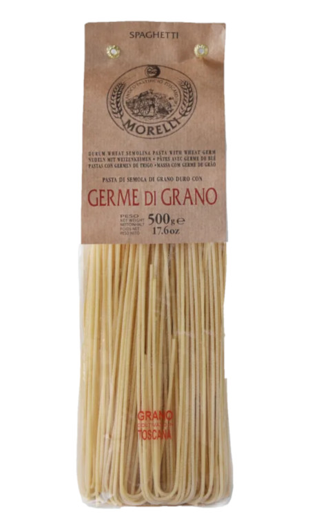 Gli Spaghetti con germe di grano dell'Antico Pastificio Morelli sono prodotti con semola di grano duro toscano, lavorati artigianalmente trafilati al bronzo ed essiccati a bassa temperatura. Si contraddistinguono per la presenza al loro interno del Germe di grano, il cuore del chicco di grano, ricco di sapore e principi attivi e nutritivi. Normalmente durante la macinazione del chicco di grano, il germe viene tolto, per facilitare la conservazione delle farine. Il Pastificio Morelli, attraverso l’uso di tecniche artigianali, riesce a reinserirlo, perché lo lavora fresco immediatamente. Durante la cottura si sprigiona un intenso profumo di grano e l’acqua si tinge leggermente di verde proprio per la presenza del germe di grano fresco. Hanno una cottura di soli 8 minuti, sono porosi, consistenti e gustosi al palato.